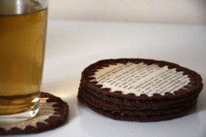 Pár éve újrafelfedeztem magamnak a horgolást. A poháralátétek kapcsán pedig ezt ötvöztem a papírral, mégpedig úgy, hogy a kör alakúra vágott könyvlapok széleit előbb kilyukasztva körbehorgoltam, legvégül pedig lakkal lefújva tettem vízhatlanná őket.