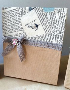 A cipősdobozok könyvlapokkal és csomagolópapírral való bevonása nagyon egyszerű, hiszen csak megfelelő ragasztó és papír kell hozzá. Ezen dobozokhoz decupage ragasztót és ragasztólakkot használtam, valamint könyvlapokat és egyszerű háztartási csomagolópapírt, valamint megpróbáltam feldobni egy kis csipkével és néhány gombbal. Az eredmény pedig önmagáért beszél. Igazi vintage stílusú tárolók!