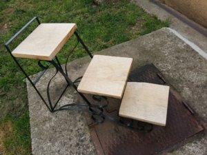 Amit Apukám készített tavaly ősszel. Mivel elég későn, majdnem tél elején került végre a neki szánt helyre, így eredeti rendeltetését nem tudtam kipróbálni, vagyis virágdíszt nem kapott. Viszont a hosszú tél alatt megedződött, valamint én is átláttam, hogy csak úgy, egyszerűen ráhelyezni néhány virágcserepet nem lehet. Ugyanis eléggé szeles helyen élünk, amiből adódóan hetente cserélhetném a virágokat és kaspóikat az állványon. De valami megoldást találnom kellett!