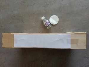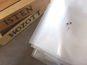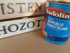 Miután a ládák minden oldalára felvittem a szöveget, három rétegben lelakkoztam kívül-belül mindkettőt. Ehhez Sadolin lakkot használtam. Bár azt írja rajta, hogy parkettalakk, biztos, hogy kültéren is megállja a helyét.