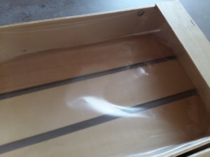 Hogy még tartósabbak és strapabíróbbak legyenek, legvégül kibéleltem a ládákat egy-egy nylon darabbal, amit rajzszöggel rögzítettem a belsejükbe.