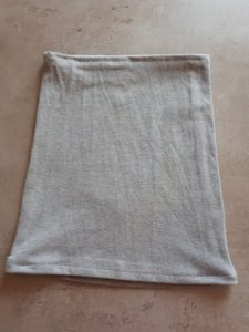 Egy igen jó minőségű szabadidő nadrágom adta meg magát, azt gondoltam felhasználni a nyakmelegítőhöz. A nadrág szárából levágtam a kívánt hosszúságú darabot, majd beszegtem. Mivel nincsen még lock varrógépem, sima varrással szegtem be.