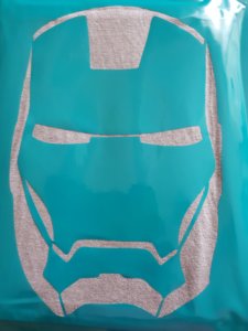 Ezt követően egy kartont helyeztem a nyakmelegítőbe, hogy ne üssön át a festék, majd hordozófóliával ráragasztottam a matricát az anyagra.